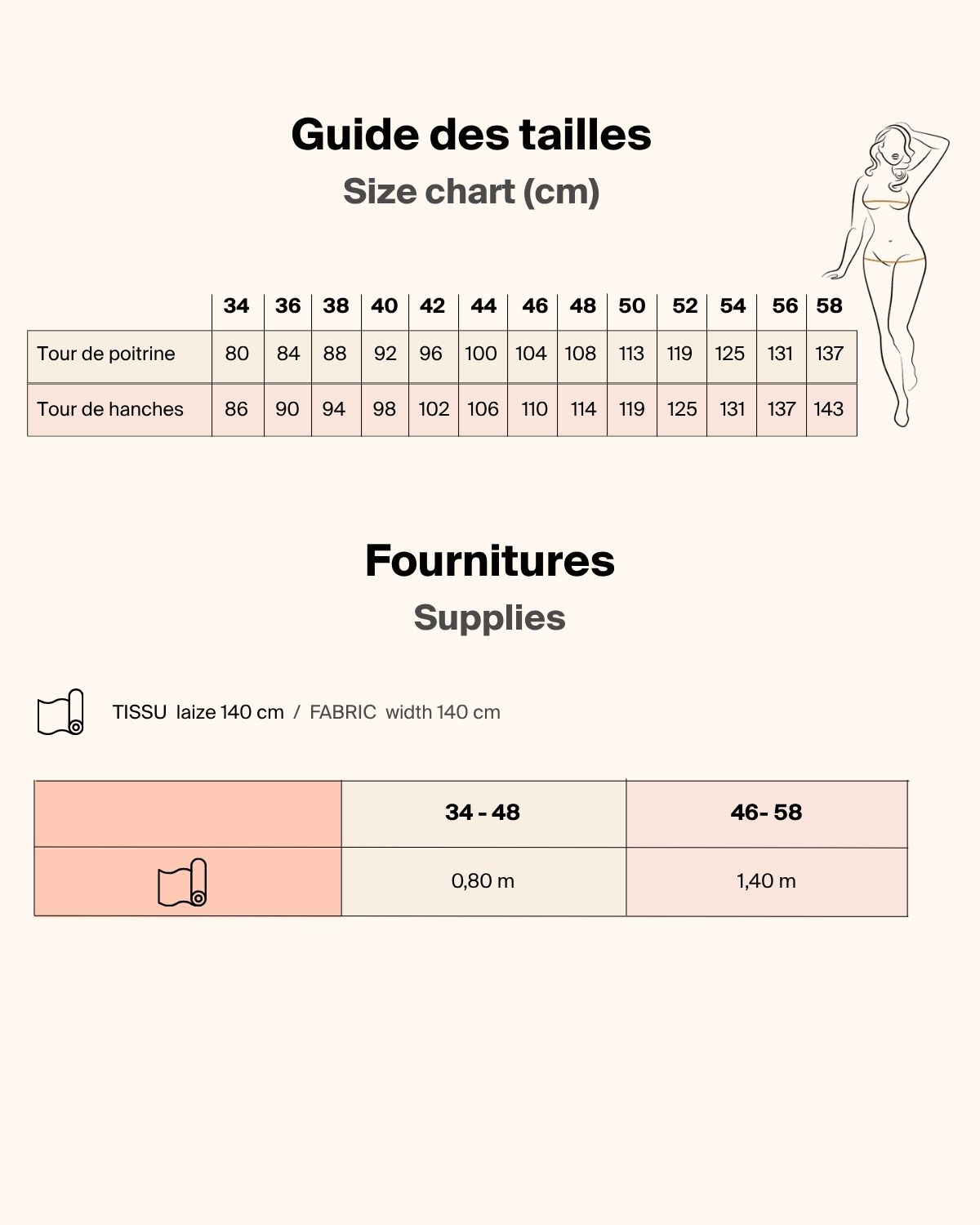 | Tissu en laize 140 cm | 0,80 mètre | 1,40 mètres | |