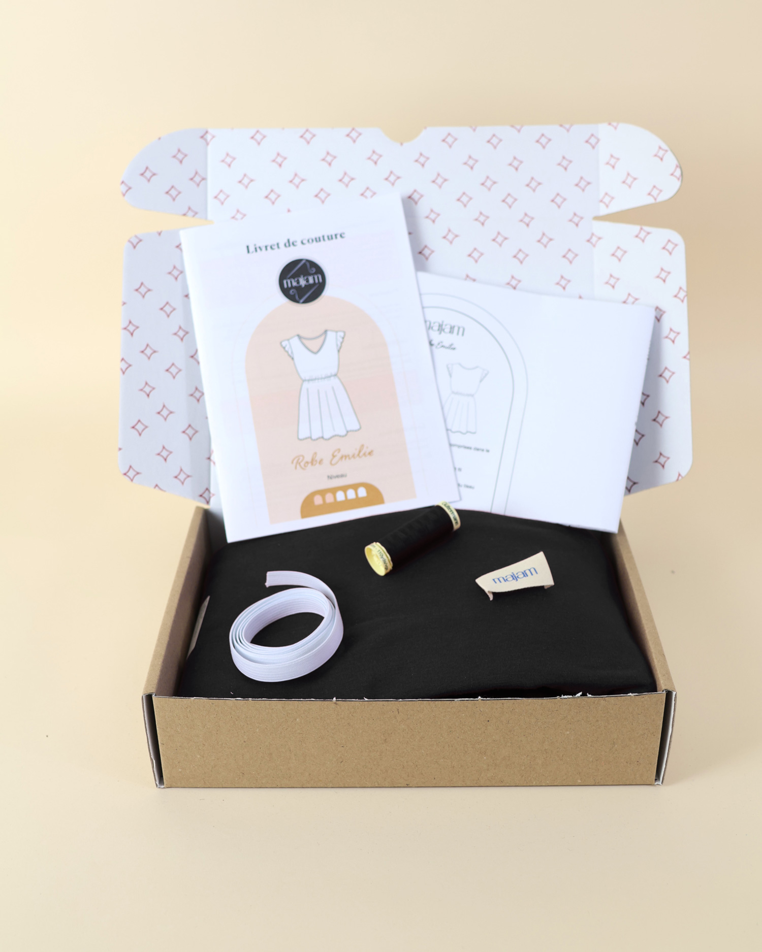 Un kit contient le tissu et la mercerie pour réaliser le vêtement.