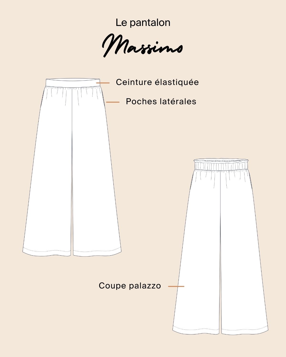 Massimo est un patron de pantalon large à la coupe palazzo. L’effet taille haute et jambes longues allonge la silhouette.