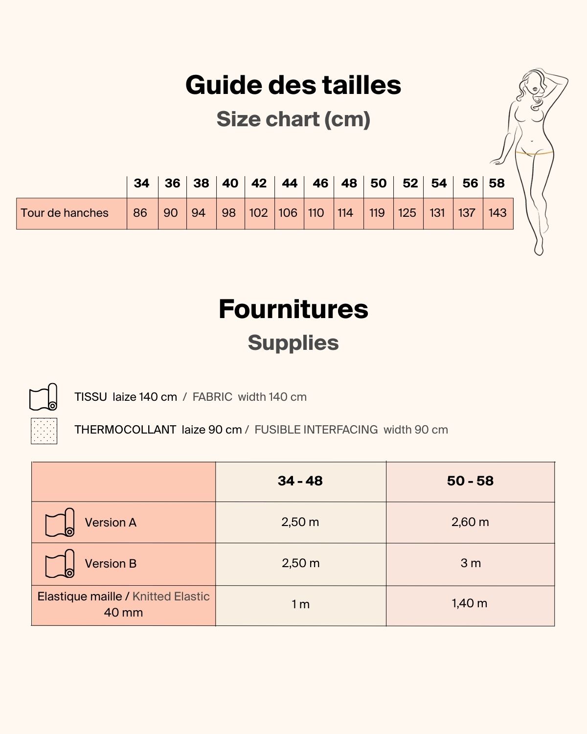 • la planche à patron imprimée en taille réelle dans les tailles 34-48 ou 46-58