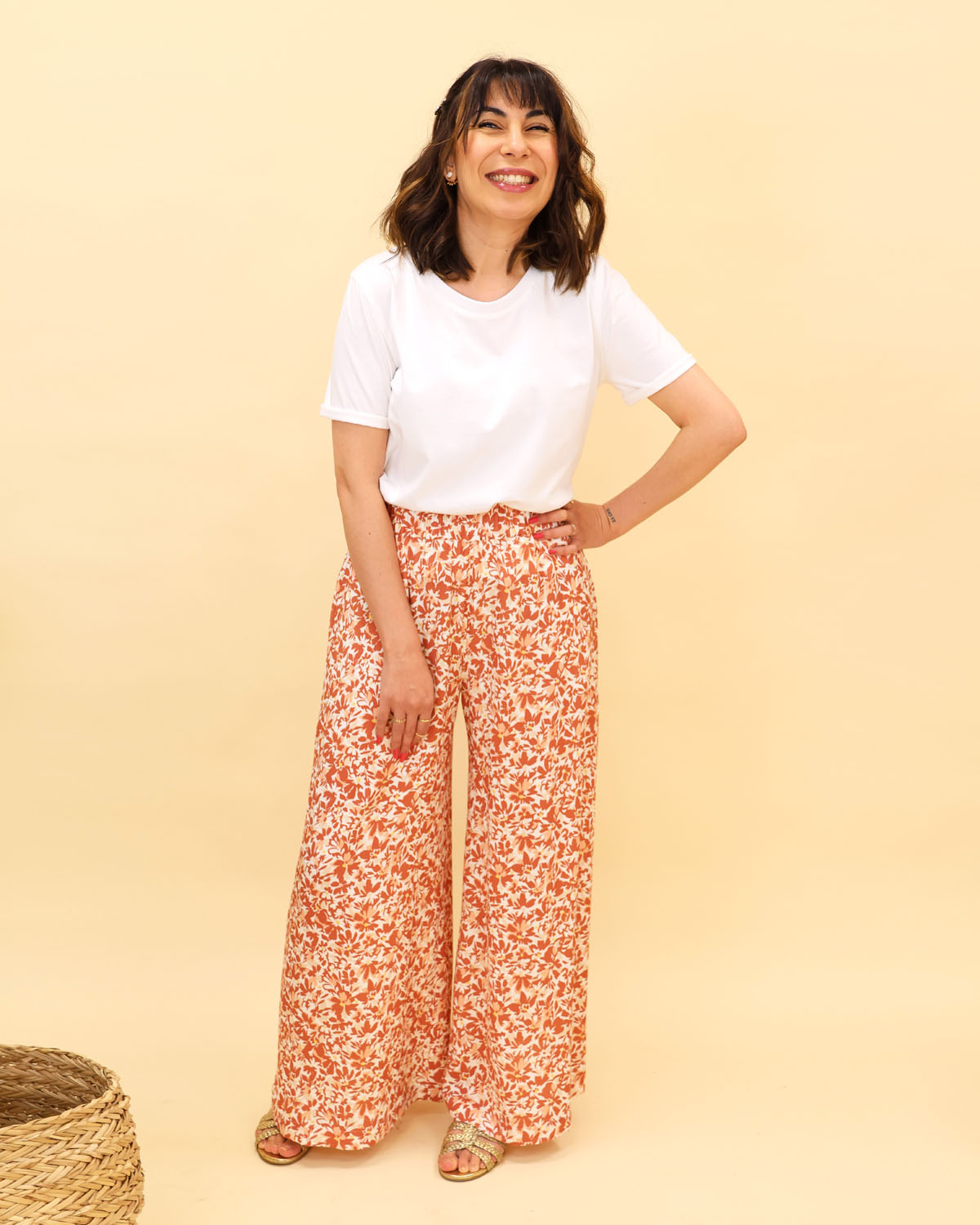 Massimo est un patron de pantalon large à la coupe palazzo. L’effet taille haute et jambes longues allonge la silhouette.