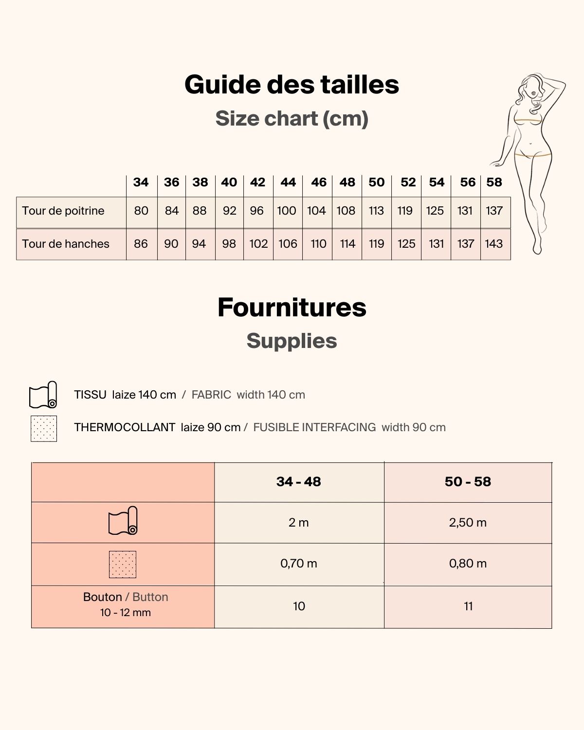 | Tailles | 34 – 48 | 50 – 58 | ||