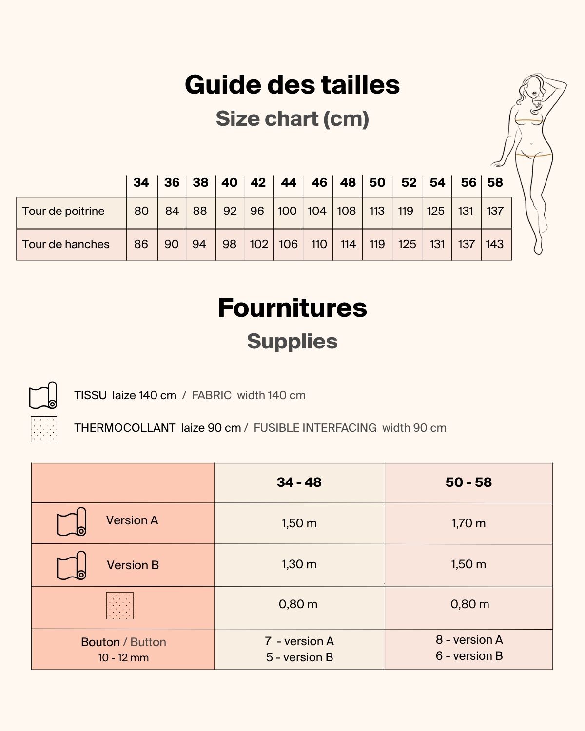 | Tissu en laize 140cm | 1,30 m | 1,50 m | 1,50 m | 1,70 m |