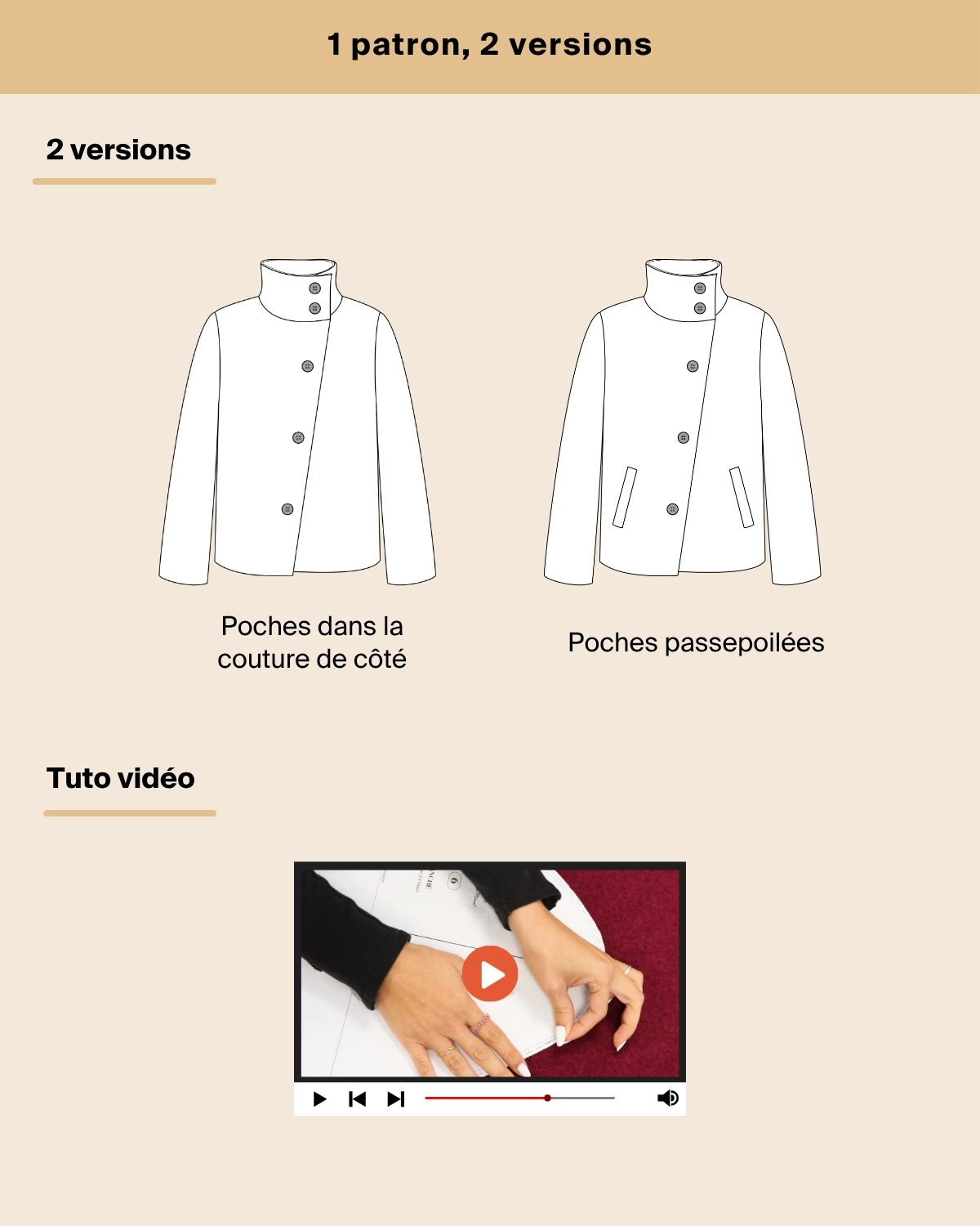 Pour ce modèle, nous vous conseillons des tissus épais qui tiennent chaud. Les tissus à base de laine comme la laine bouillie, les draps de laine, ou les tweed seront parfaits!