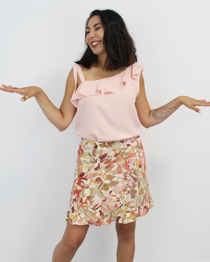 Ce patron est une jupe portefeuille ornée d’un volant froncé dont la taille augmente en fonction de l’arrondi du devant. Afin de préserver votre intimité, le pan du dessous est très couvrant ;). La jupe se ferme par 2 boutons. Avec ses airs hispaniques, cette jupe apporte du pep’s à votre tenue !