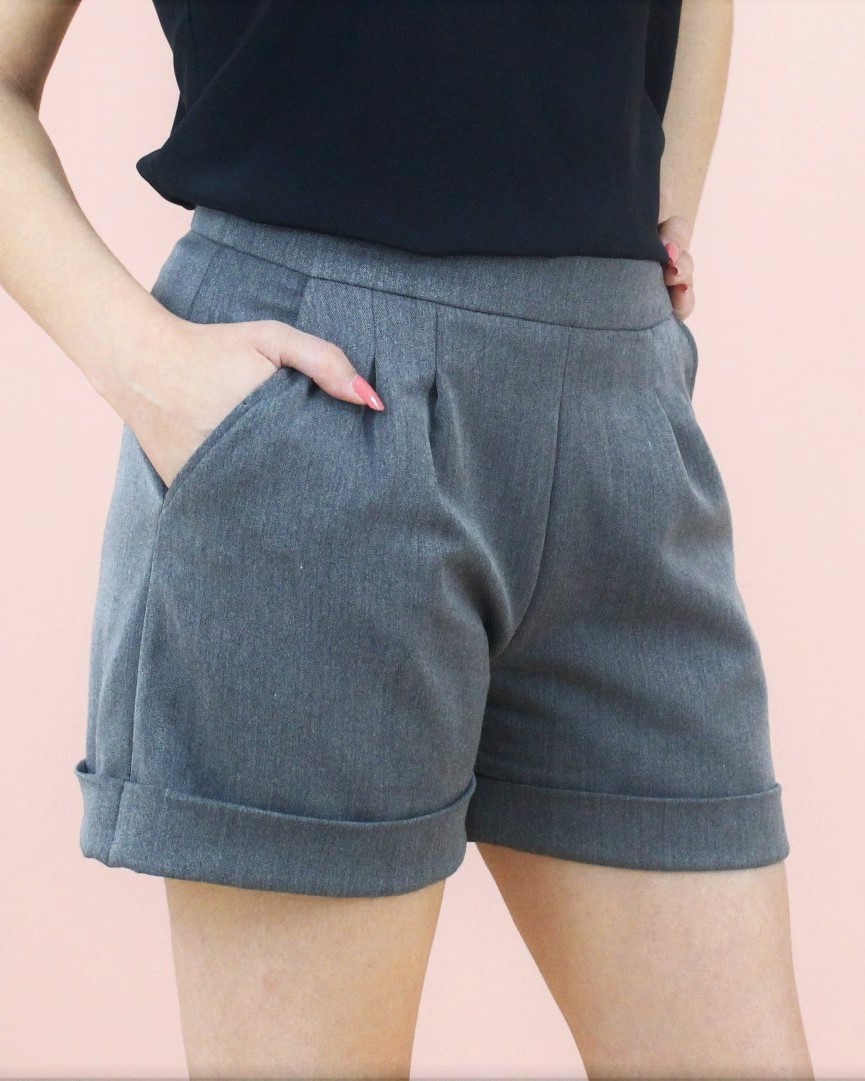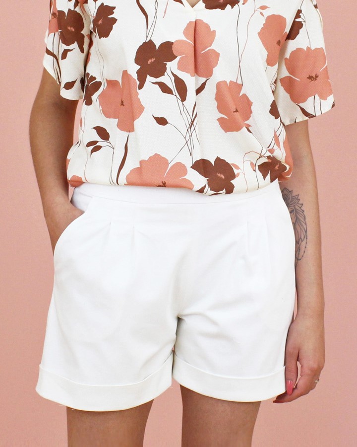 Ce patron de short à revers comporte 4 plis piqués sur le devant et 2 pinces dos. Il se ferme par un zip invisible sur le coté. Son revers de bas de short lui confère un coté moderne que l’on adore ! Le +: Il peut être cousu avec ou sans doublure ce qui permet d’oser tous les coloris !